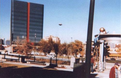 1996年1月的一天,一些工人正在给美国科罗拉多州丹佛市的一座城市纪念碑上的金球刷漆,摄影师乔-克罗尔在给他们拍照时候发现天空中出现一个奇怪的钟形物体。