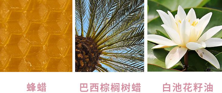 蜂蜡起到温和保护的效果,巴西棕榈树蜡具有持久固色不晕染的功效,白池花籽油保证控油清爽不粘腻。
