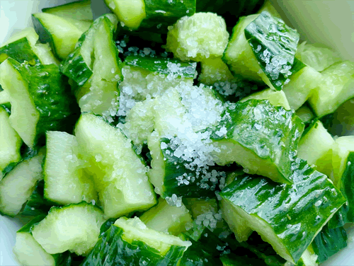 3、很多拍完黄瓜就直接调味了,其实也可以,如果想要更脆爽,那必须进行腌制杀水,把内部的水分逼出来,放半勺食盐,搅拌均匀,放在一边腌制15分钟。