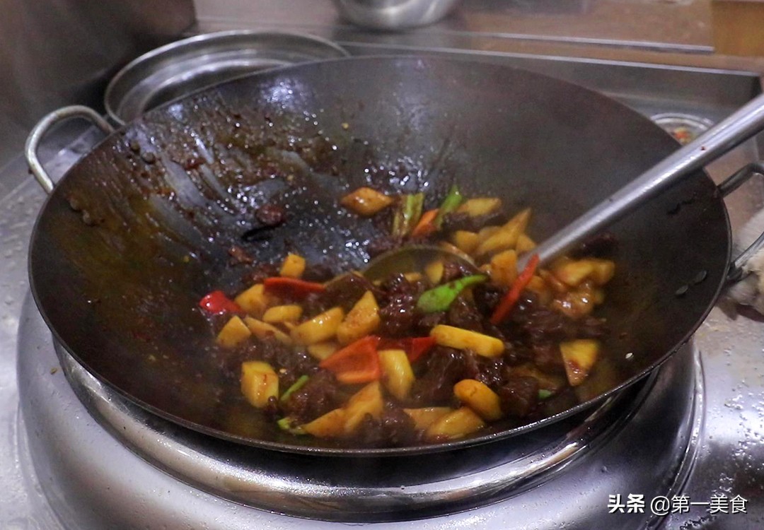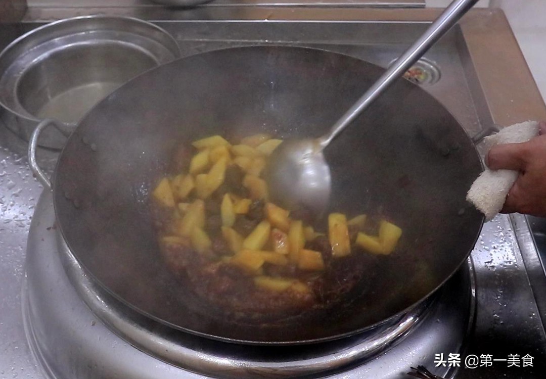 为了减少油腻感,我们把酱牛肉和土豆再加工一次,把牛肉重新倒入炒锅里面,放入土豆,开大火收汁,期间要经常翻动以免糊锅。