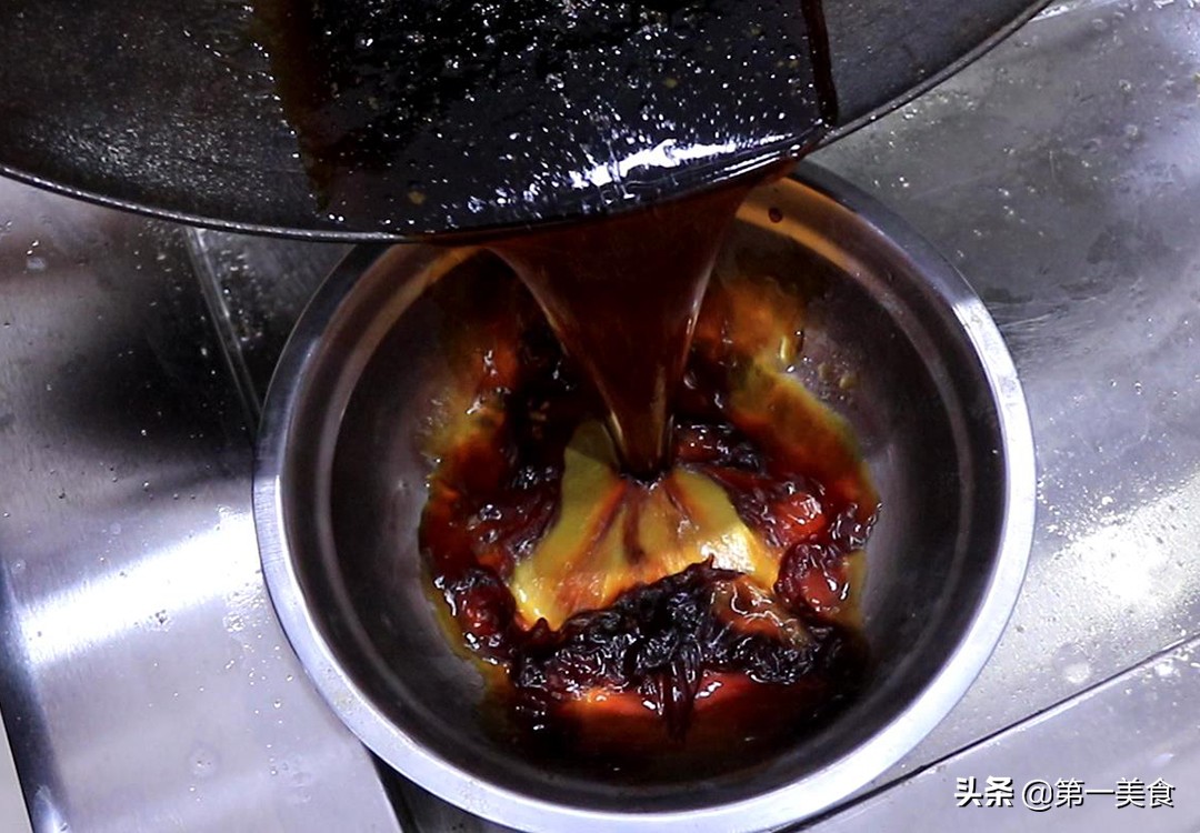 锅内留少许的植物油,倒入白糖30克,用最小火把白糖炒至全部融化,不停地搅拌,当颜色变成红棕色时,从锅边淋入少许清水,搅拌均匀,倒在小盆中放在一边备用。
