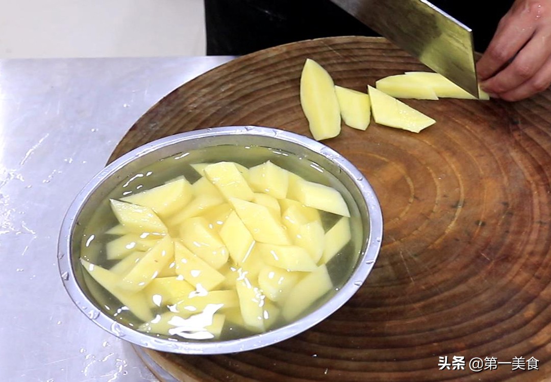 准备土豆两个,削去外皮,把土豆先切成厚片,再切成菱形块,