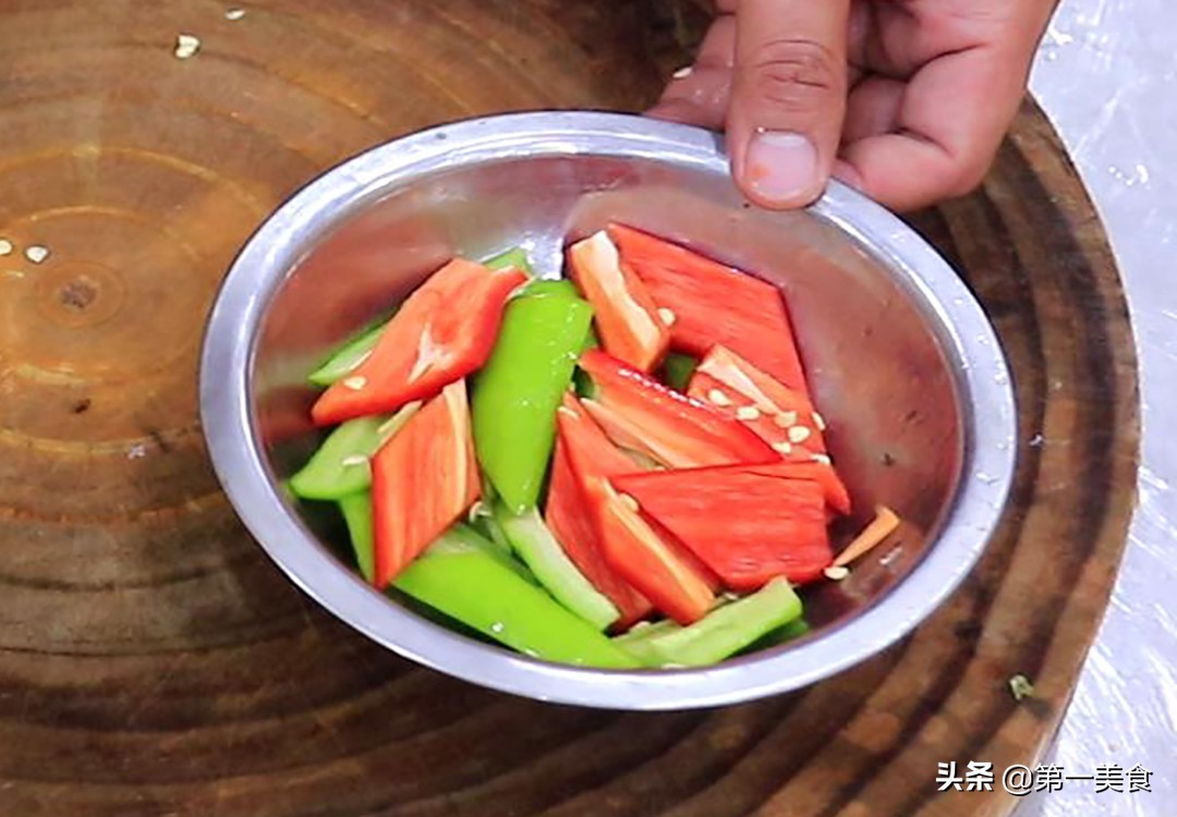 准备青椒和红椒各一个,切成片,主要用来配色。