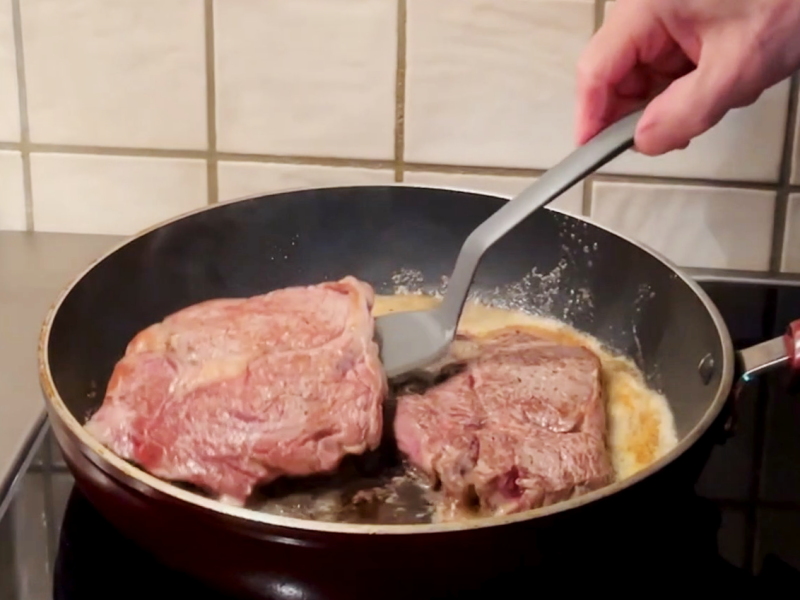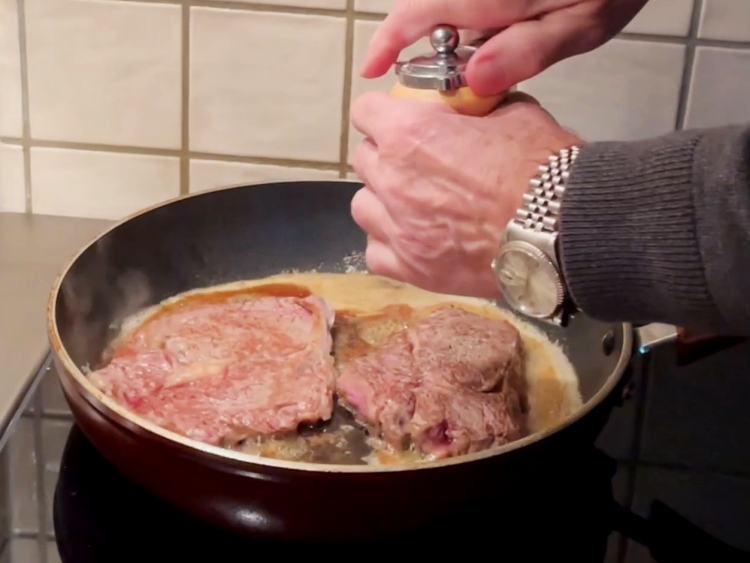 3.当黄油融化,并且有一点褐色的时候,将牛排重新放回锅里。撒上现磨的海盐和黑胡椒,煎1.5-3分钟翻面,这要看肉的厚薄,还有你要吃几分熟。全熟不提倡,因为根本就咬不动,那就把这款牛排浪费掉了,你不如吃炒肉片,或者炖牛肉。