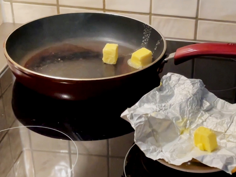 2.接下来把火调小,放黄油。
