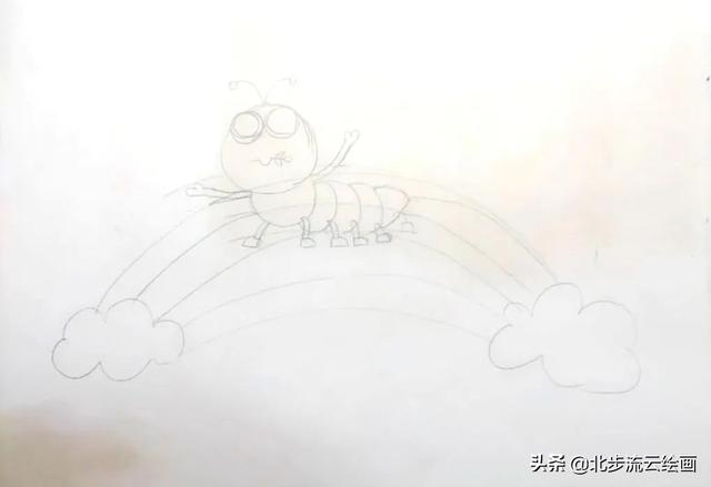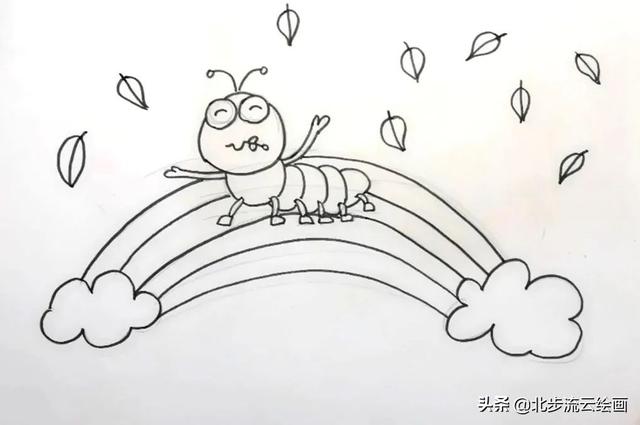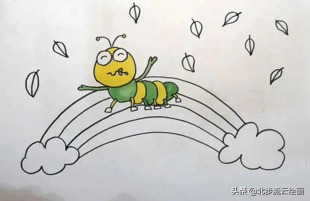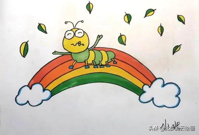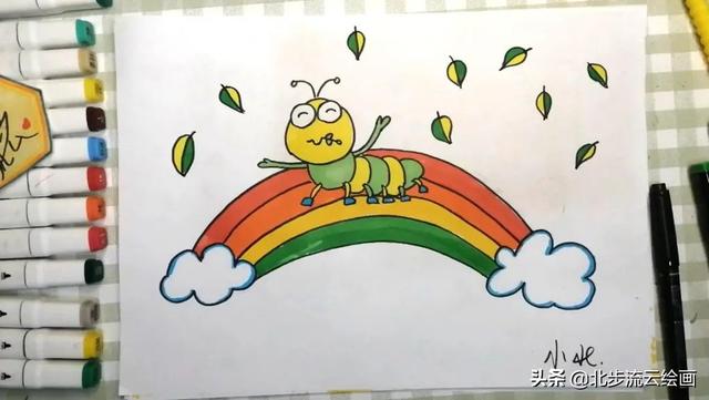 这样一幅爬在彩虹桥上的毛毛虫儿童画就画好了画画,是不是非常简单,小朋友毛毛虫们学会了吗,快点动手画起来吧,一年级毛毛虫数学题毛毛虫怎么画,毛毛虫怎么画一步一步教。