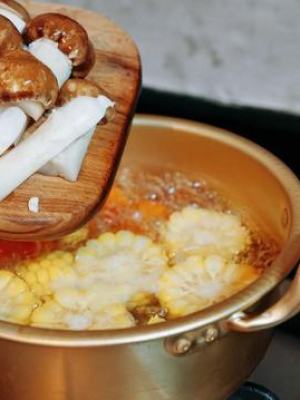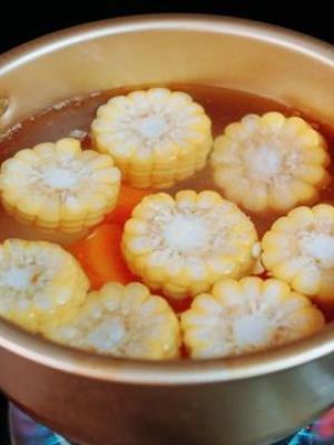 锅中加入适量干松的茸菇清水,胡萝卜去皮和炒玉米切成块状,放入大全玉米和胡萝卜,把蔬菜大全的甜味先煮出来。