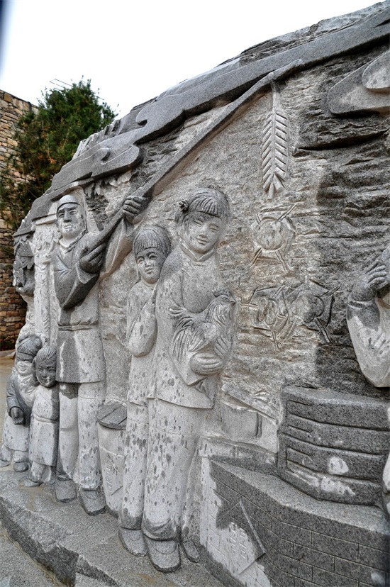 这组浮雕展示的是:永远的新娘--1945年的4月份蒙阴县李家保德村有一个姑娘叫李凤兰和邻村的王玉德订了婚,但还没等到办婚礼,王玉德就参军入伍上了前线。李凤兰是一个深明大义的好姑娘,为了让未婚夫安心打仗,就提前住进了王家,照顾王玉德的老母亲。但是李凤兰始终没有等到未婚夫的归来。直到十二年后才终于等来了一封信,是他未婚夫的革命烈士证书。李凤兰终生未再改嫁。