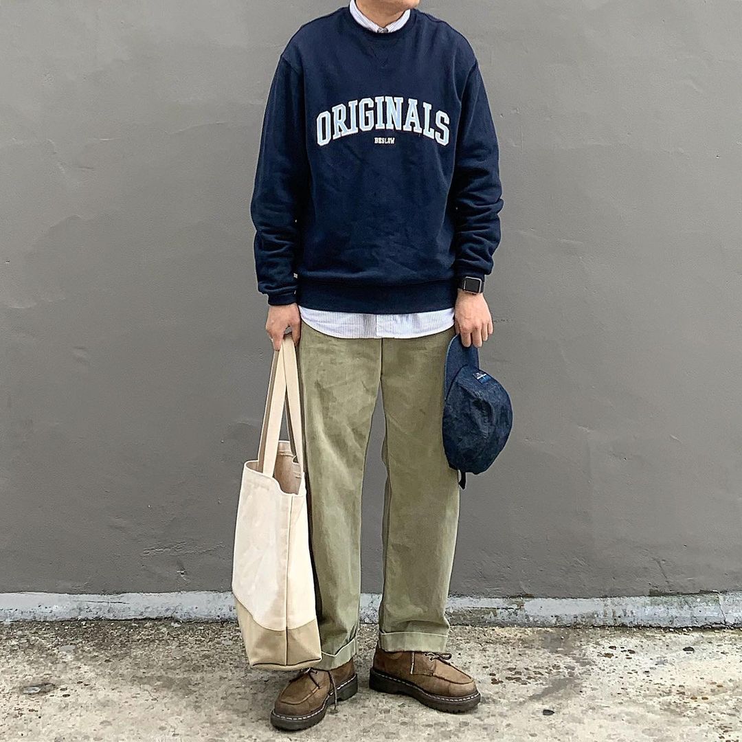 天气不怎么冷的南方,其实衣服不用穿得太多,一般厚度的衣服就可以了。我们可以选择一件藏青色的圆领卫衣,字母印花显得特别简约干净。里面搭配一件白色的衬衫,既可以修饰脖颈,也能够打造层次感。裤子则选择浅绿色的休闲裤,优雅大方。再穿上一双马丁靴,尽显潮男魅力。