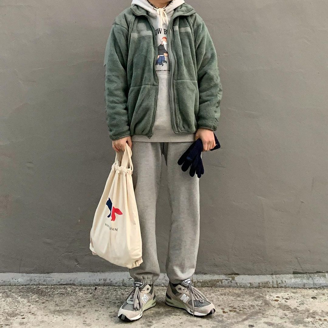 灰绿色的棉外套,穿上就显得特别温暖。里面搭配连帽卫衣,保暖又有个性。裤子再选择灰色的运动裤,特别吸引眼球。鞋子则穿上经典的NB潮鞋,整套穿搭率性低调,气质满满。
