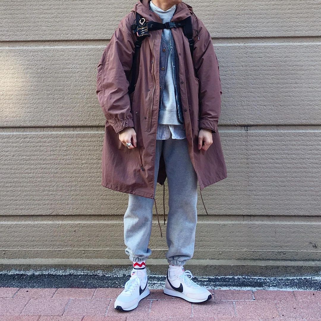 look4:酒红色风衣+灰色卫衣+灰色裤子+NIKE运动鞋