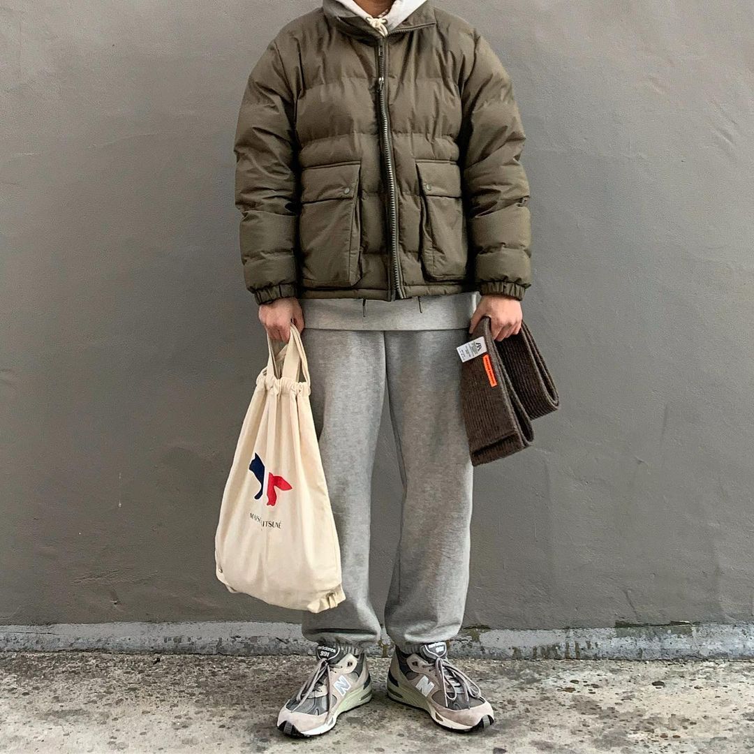 在天气比较寒冷的北方,则少不了一些棉服或者羽绒服,以更好地来保暖。土色的棉衣简单低调,里面搭配一件灰色的连帽卫衣,增添保暖效果。裤子则选择今年大火的灰色运动裤,非常轻松舒适。鞋子选择灰色的NB运动鞋,整个人看起来就更加年轻帅气了。