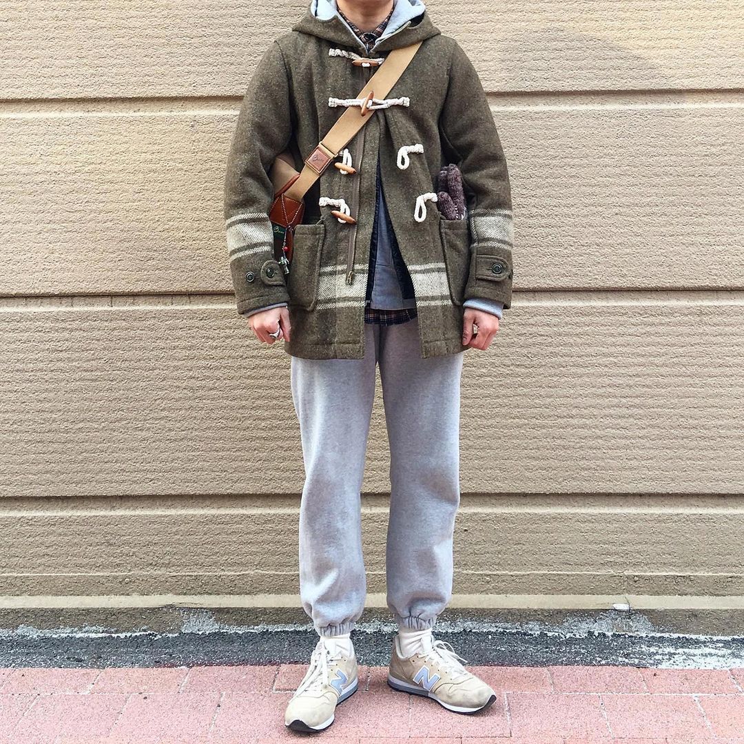 look1:土色棉衣+灰色连帽卫衣+灰色裤子+NB运动鞋