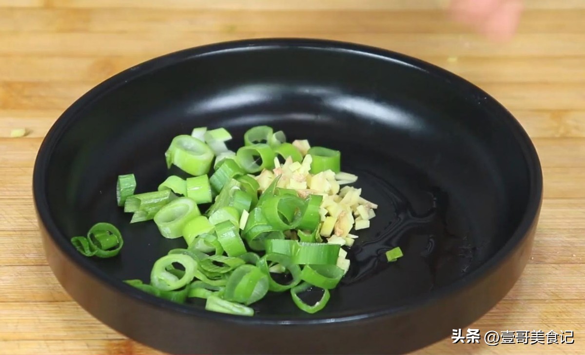 3.准备两个小葱,一小块生姜,全部放进水盆子里,倒入清水进行清洗。清洗干净之后,一起捞出来控水。将控完水的小葱放在案板上,用菜刀切成薄薄的葱花。再将生姜拿过来,先切成片,再切成丝,最后切成生姜沫。把切好的葱花和姜沫放在一起待用。