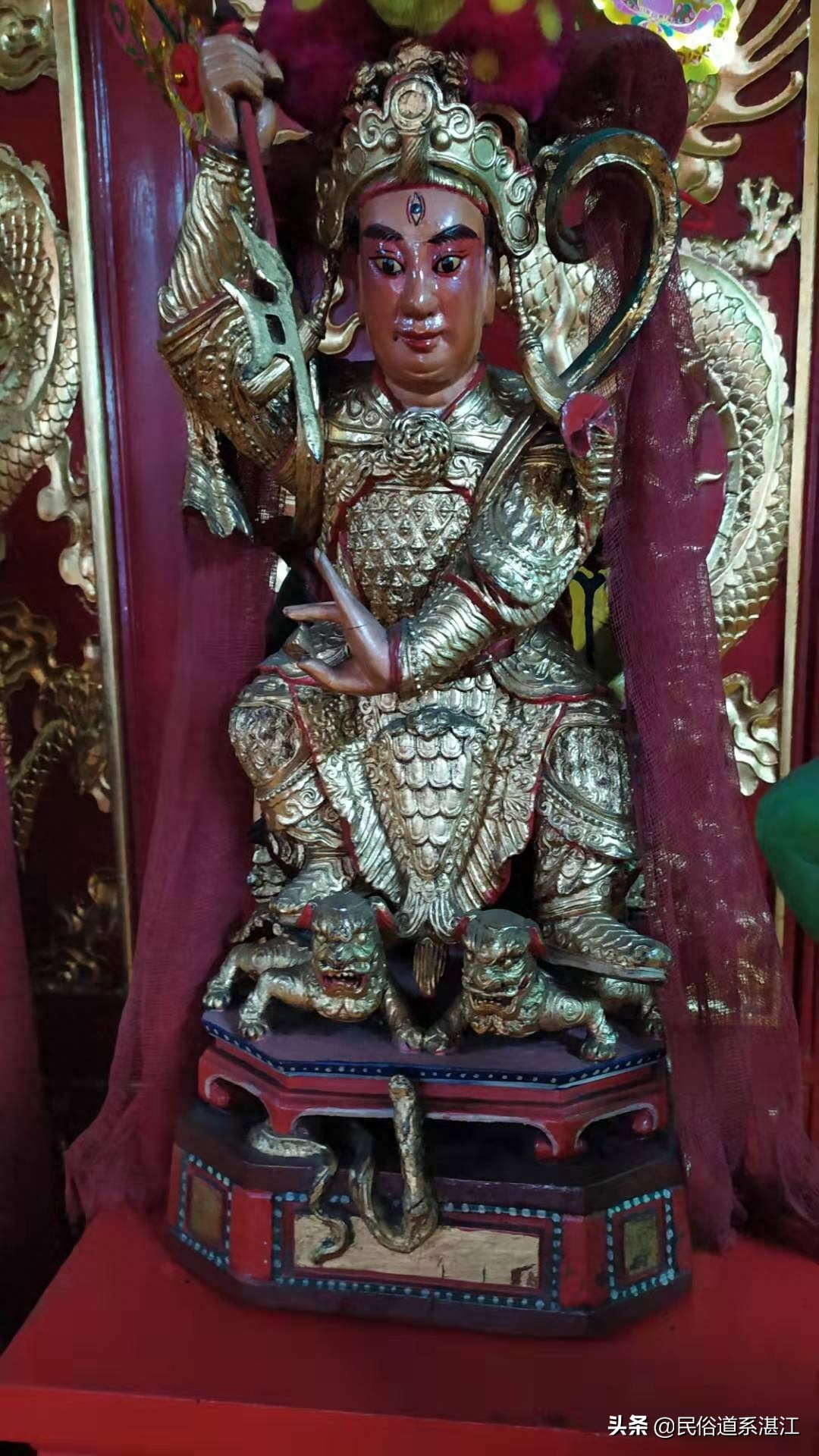 说到华光大帝的形象,《三宝大监西洋记》中描绘马元帅的形象是白白的,白如雪:一称元帅二华光、眉生三眼照天堂。头戴攒顶帽,三角金砖在神儿藏。湛江地区供奉的华光大帝造像也是如此,英俊潇洒,阳光帅气,有的是端坐在椅子上,有的身骑白马,脚踏白蛇、火鸦、火轮,威武霸气,标准的大帅哥一枚。如此形象,自然也是年轻人崇拜的偶像,在湛江地区,尤其是醒狮团、武馆的年轻人对年轻帅气的华光大帝崇拜有加,丝毫不输给那些娱乐圈的偶像明星。