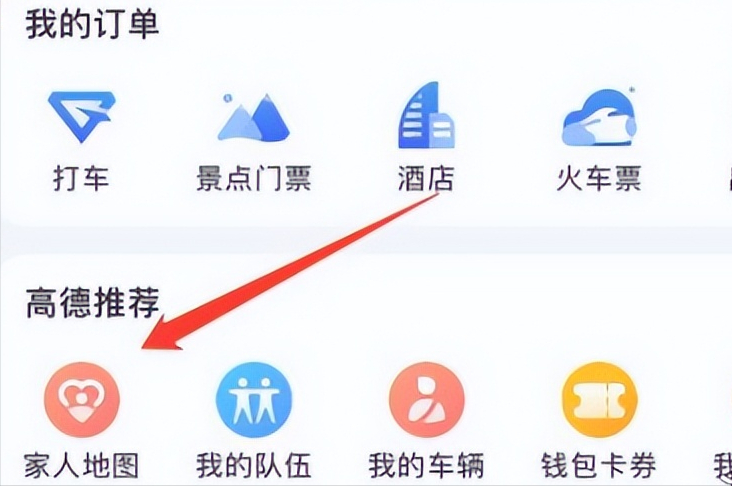 3.登录后,在高德地图右下方找到【我的】,在新弹出的页面中,有个【高德推荐】栏目,在这个栏目下面,我们用手指往左边滑动,就会看到一个【家人地图】,找到【家人地图】后,我们点进去;