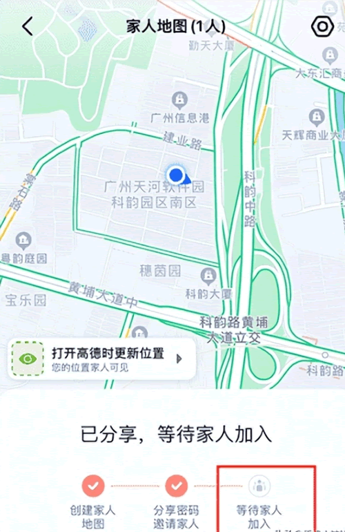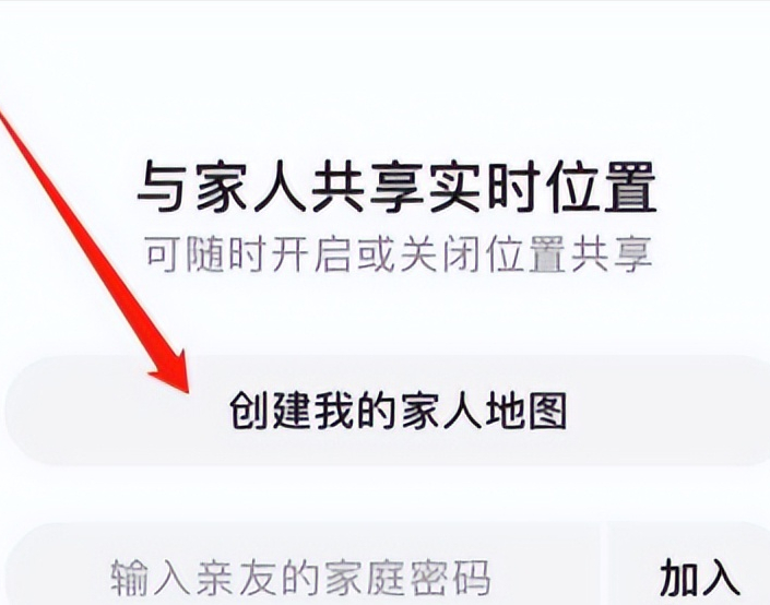 5.这个时候,我们需要通知对方,打开他手机上的高德地图,点【我的】-点【家人地图】-【创建我的家人地图】-把我们刚才发给对方的密码复制到【加入】前面的编辑框,页面就会自动跳转到高德地图上,并且在地图上同时显示双方的位置了。