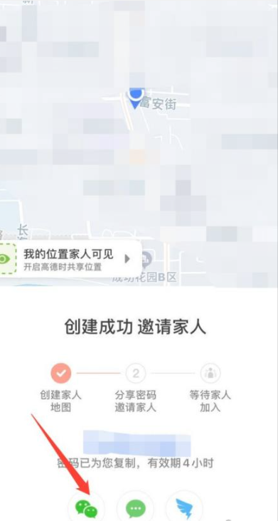4.点进去后,新弹出的页面,有个【创建我的家人地图】,我们点击一下,这时候,页面会提醒我们:邀请密码已经生成(这个密码的样子大致是:JWUU43YT),并且在这个生成的密码下方有微信、短信或者钉钉等分享按钮图标,这里我们选择微信分享,点一下微信图标,就会进入到微信页面,找到我们时刻关心的那个人的微信,然后在会话框中长按,弹出粘贴提示时,点击粘贴,并点击发送,我们就可以把这个密码发送给对方了。