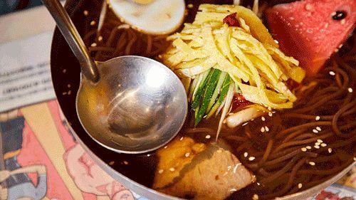 延吉冷年以荞麦面为主,面上盖着牛肉、苹果、泡菜,上桌前从大桶中舀一勺冰凉酸甜的汤料,满满的一碗凉爽。冷面讲究的是汤清—牛肉汤定是要将浮油撇清的;凉爽—无论是汤还是面,都要冰凉后食用。只有这样,才能将炎热之气统统冰走。