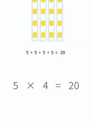 同样饭圈的20个正方形,我们以一排为一组,每组4个,有5组,4+4+4+4+4=20.用乘法表示出来4×5=20,5为乘数,也就是有5组一样的数,4是被乘数,每一组都是一样的数量4个正方形。