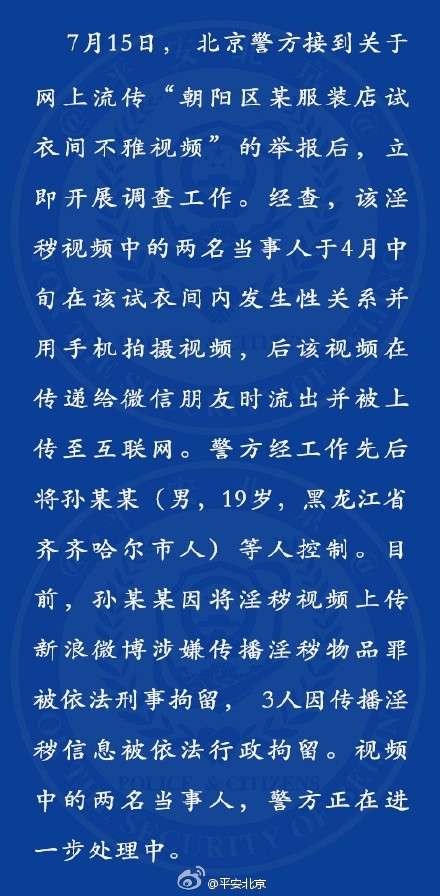 7月19日,北京警方发布通报,称优衣库不雅视频是在传递给微信朋友后流传出来的,视频中男女子于4月中旬在优衣库试衣间发生性关系并拍摄下来,警方已将上传视频的孙某某依法刑事拘留。