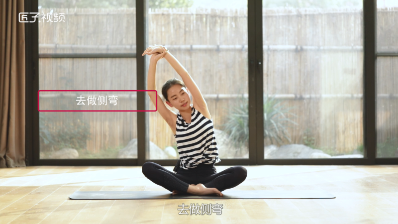2、吸气时脊柱向上去做拉长,呼气时将身体倒向右侧,去做侧弯;