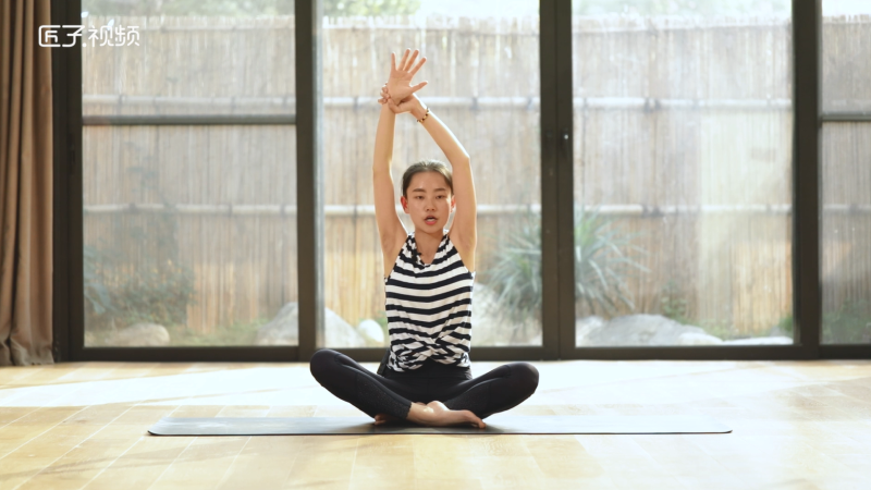 6、下次吸气将身体回正,双手依次落下,重复一两次动作。