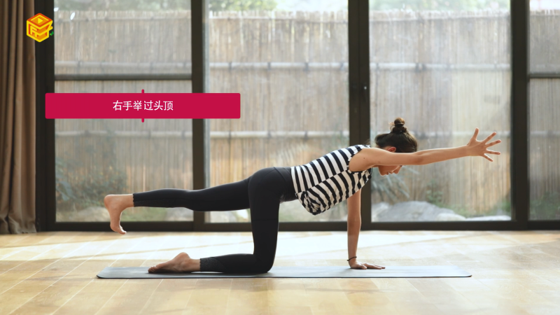 3.将重心移到左手,慢慢吸气将右手举过头顶,保持平衡;