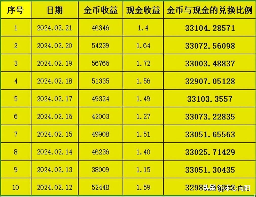 10、2024年2月12日:金币收益52448;现金收益1.59元,金币与现金的兑换比例32986:1