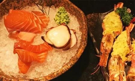 接下来海鲜生鲜区:三文鱼,金枪鱼,这些海鲜类食品味道鲜美,可以生吃,也可熟吃,在吃其他东西食物前,绝对是刺激味蕾的绝佳选择。