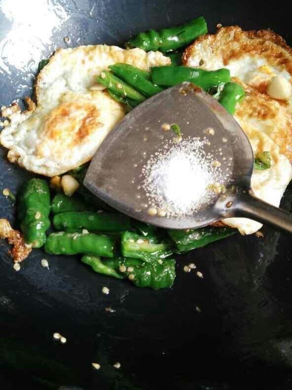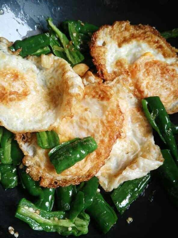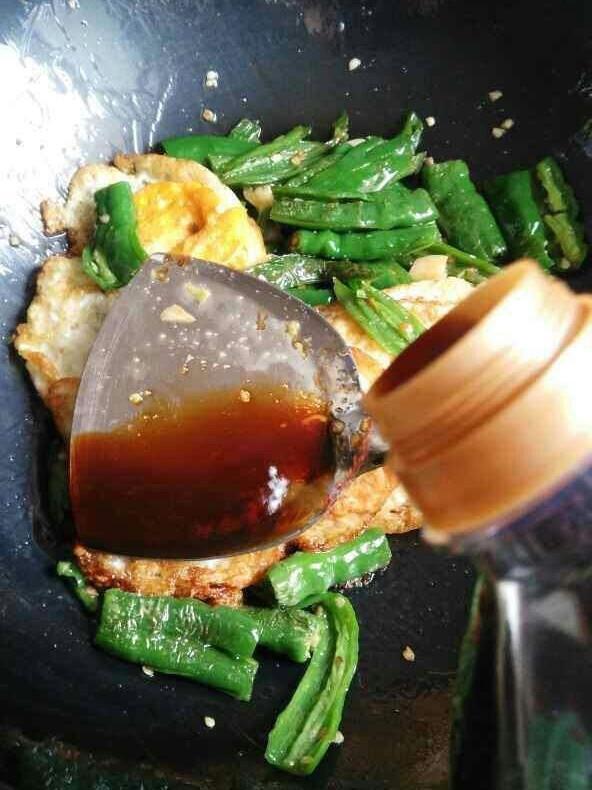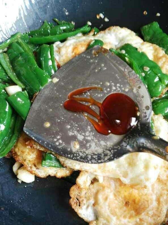 鸡蛋 4个、尖椒 200克、花生油 40克、精盐 2克、生抽 10克、蚝油 3克、大蒜籽 3粒