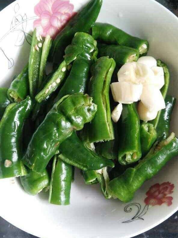 步骤1.青辣椒洗净沥干水份,用刀拍扁切段,大蒜籽去皮洗净,拍扁切碎