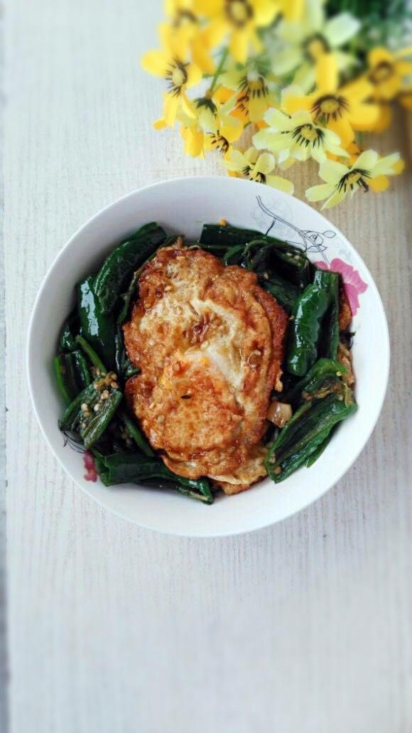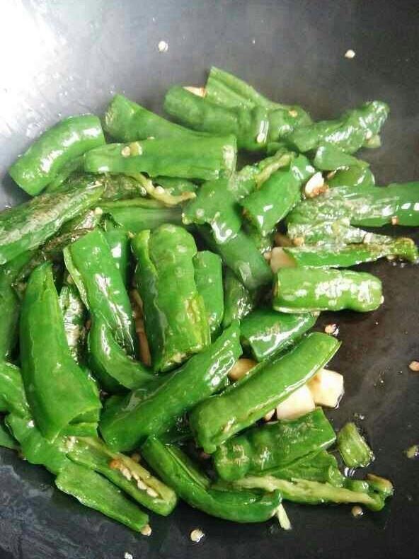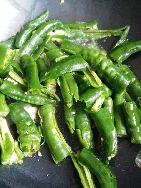 步骤5.放青辣椒翻炒片刻,用铲子压几下辣椒,熟的更快