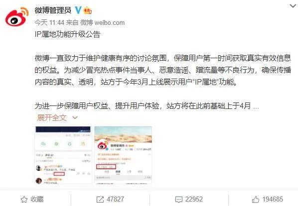 据微博管理员为减少冒充热点事件当事人、恶意造谣、蹭流量等不良行为,确保传播内容的真实、透明,站方于今年3月上线展示用户“IP属地”功能。