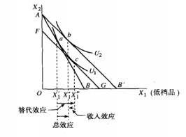 对于一般低档品来说,商品的价格下降,收入效应会导致需求量减少,替代效应会导致需求量增加,而收入效应小于替代效应,从而使商品的价格和需求量反方向变动。