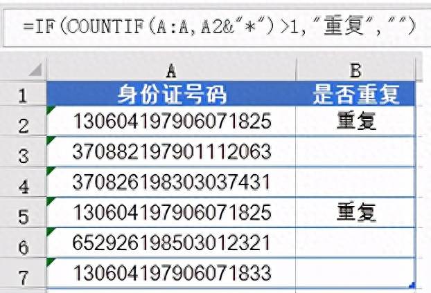 =IF(COUNTIF(A:A,A2&”*”)>1,”重复”,””)
