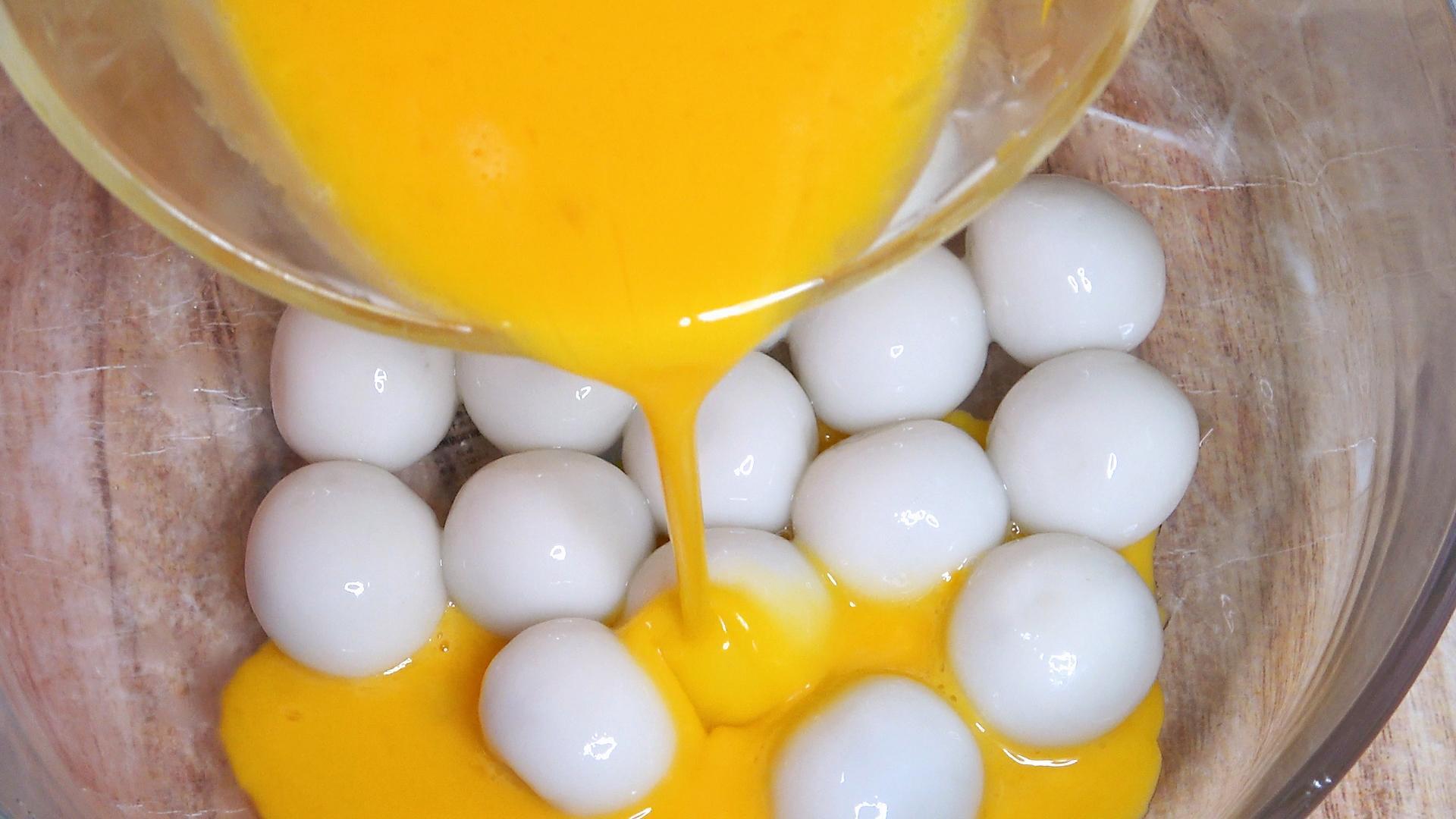 接着把沥干水分的汤圆倒入一个干净且干燥的大碗里,把之前准备好的蛋液倒进来,然后用筷子轻轻搅动,让每一个汤圆都裹上蛋液。汤圆沥干水分倒入碗里之后就要立马把蛋液倒进来,不然时间太久,汤圆之间就会粘连在一起。