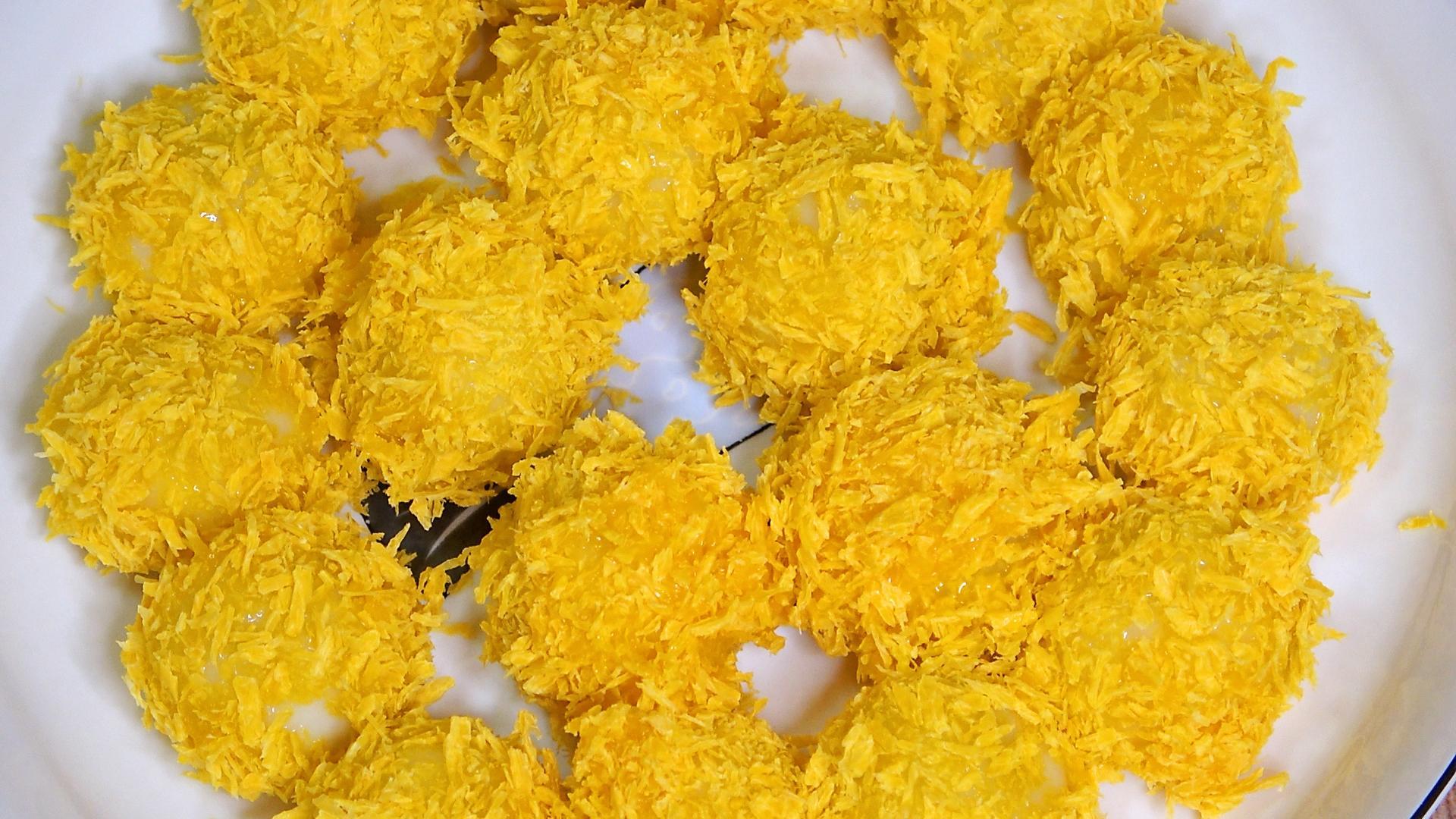 接着把裹好蛋液的汤圆放入面包糠里,让汤圆全部沾上面包糠,放入一个干燥的盘子里备用。先全部裹好面包糠再下油锅,这样一锅汤圆的成熟时间才会一致,而且下锅的时候不会手忙脚乱。