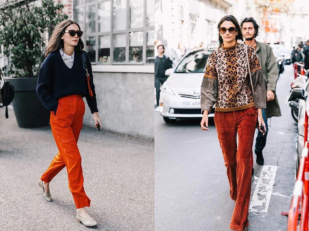 另外,这个琥珀色系视觉感很复古,我们可以利用复古面料来深化这种复古气息,比如选择灯芯绒或者丝绒材质的琥珀色系裤装,颜色和面料的融合,恰到好处,还能提升高级质感。