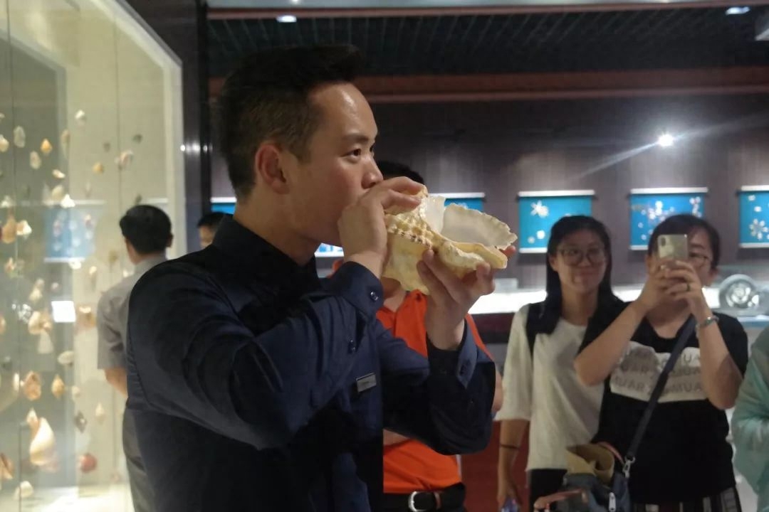 上面说到,海民常用法螺作号角,讲解员现场给我们演示了一下吹法螺,声音很嘹亮: