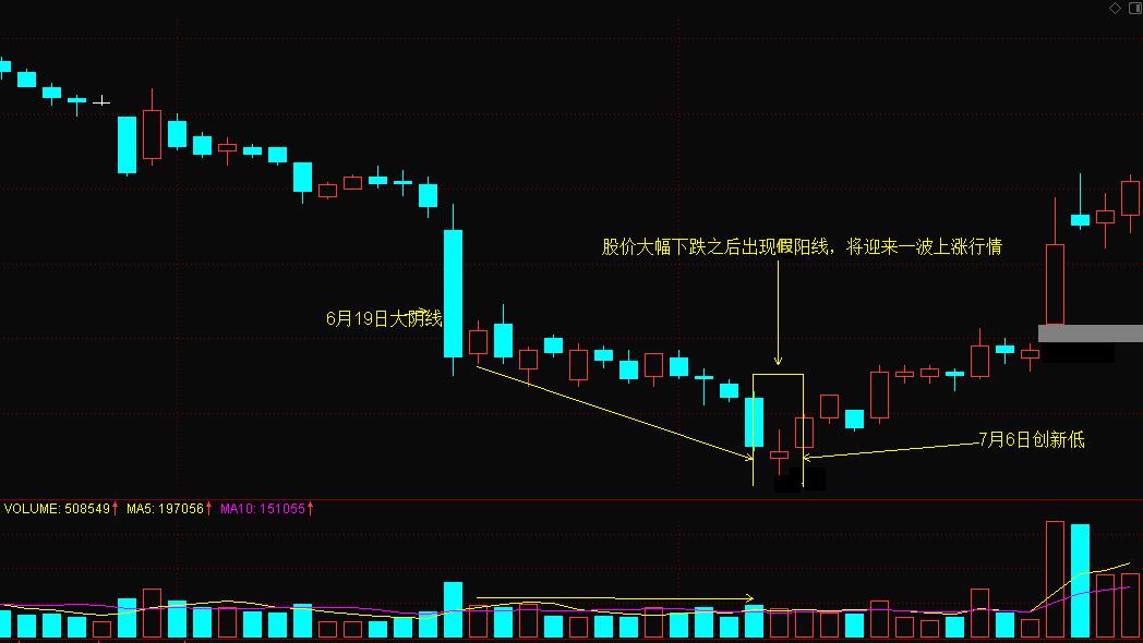 图2是梅花生物(600873)2018年7月份日K线前示意图。如图所示,梅花生物在2018年7月6日创新低之前有一波下跌行情,在下跌过程中也曾出现过几次反弹,但效果并不明显。直到7月6日,该股跳空低开收出一根小阳线(见图2黄色框),形成一根假阳线,股价企稳,走上反弹之路。出阳这根假阳线之前,从6月19日到7月6,股价继续下跌,但细心的投资者从量能看,并没有放大,说6月19日大阴线后,这段时间只是主力故意打压股价洗盘而以。虽然这根假阳线涨幅不大,但至少也说明多头开始扭转了颓势。大幅下跌后的假阳线往往是多头扭转局势的标志,出现假阳线时,投资者应该开始密切关注起来。