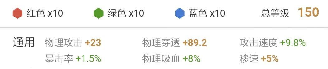 铭文总属性:物理攻击+23 物理穿透+89.2 攻击速度+9.8% 暴击率+1.5% 物理吸血+8% 移速+5%