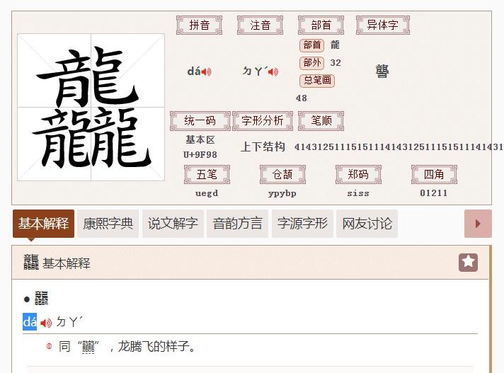 转而查阅《漢典》,我们发现在其基本解释中,“龘”被定义为同“龖”,即“龙腾飞的样子”。这与官方对“龙行龘龘”的解释相吻合。
