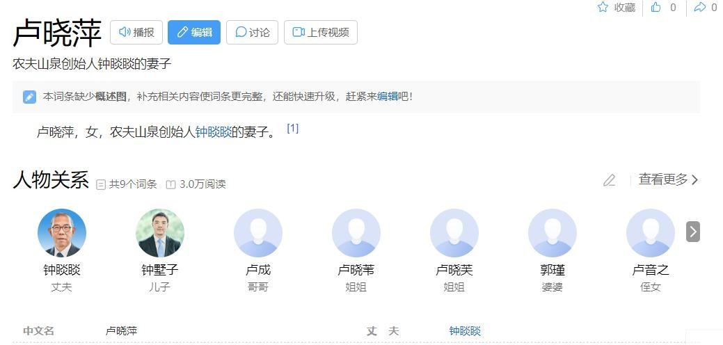 钟睒睒的老婆是卢晓萍,百度上只有一句话“卢晓萍,女,农夫山泉创始人钟睒睒的妻子”,其他任何信息都查不到,看到是被屏蔽了。