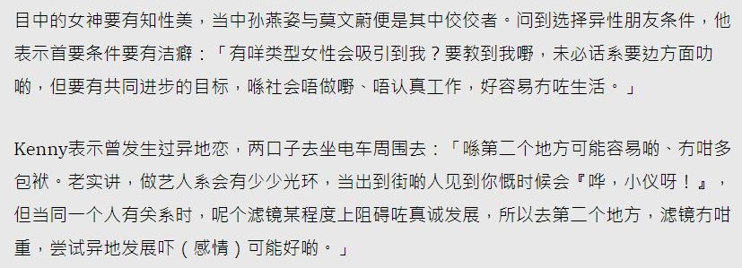 如今,关智斌又自曝有过异地恋,择偶标准对标孙燕姿和莫文蔚等女神,他和张敬轩关系或许真的仅是“全属虚构”