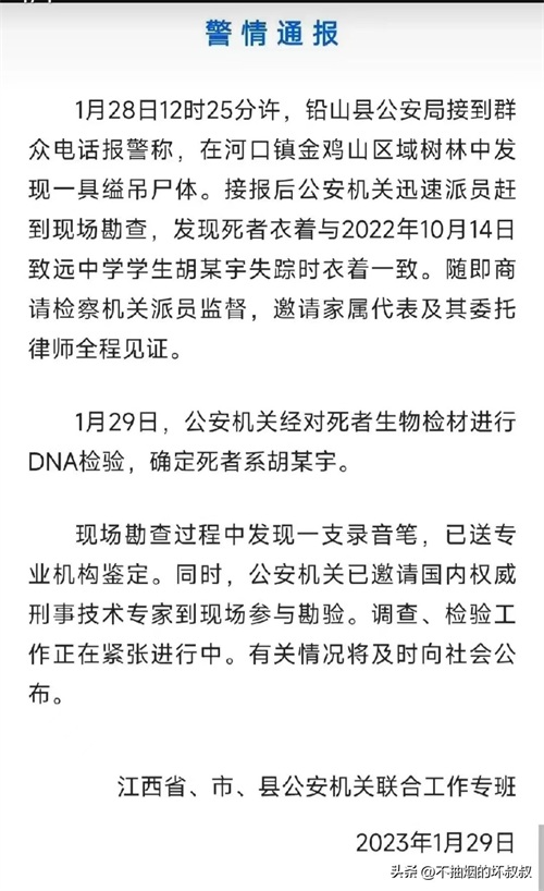 根据铅山县1月29日的警情通报,失踪了106天的胡鑫宇终于在学校旁边的金鸡山区域内的树林中被找到,群众发现时尸体处于“溢吊”状态。