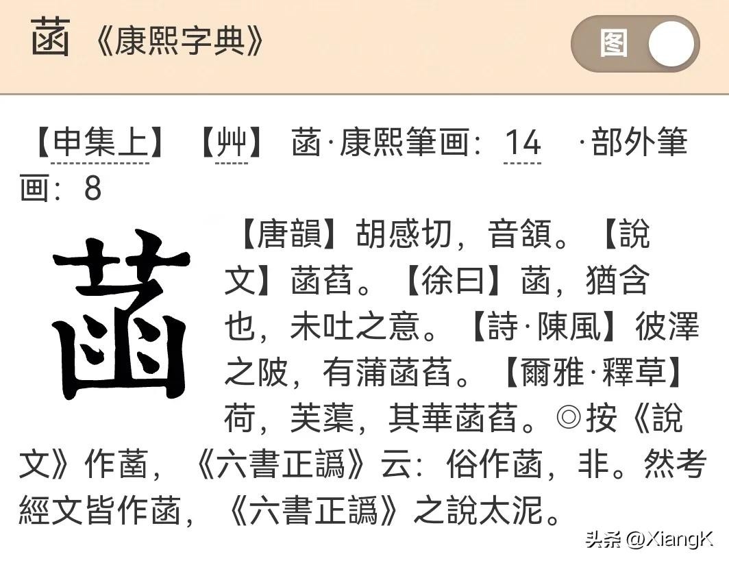 “菡”字由“艹”(草字头)和“圅”(函的正体字,象征装箭的箭筒)两部分组成。其中,“艹”部首揭示了它与植物的联系,而“圅”部则以箭筒为喻,生动描绘出荷花箭的独特形态。