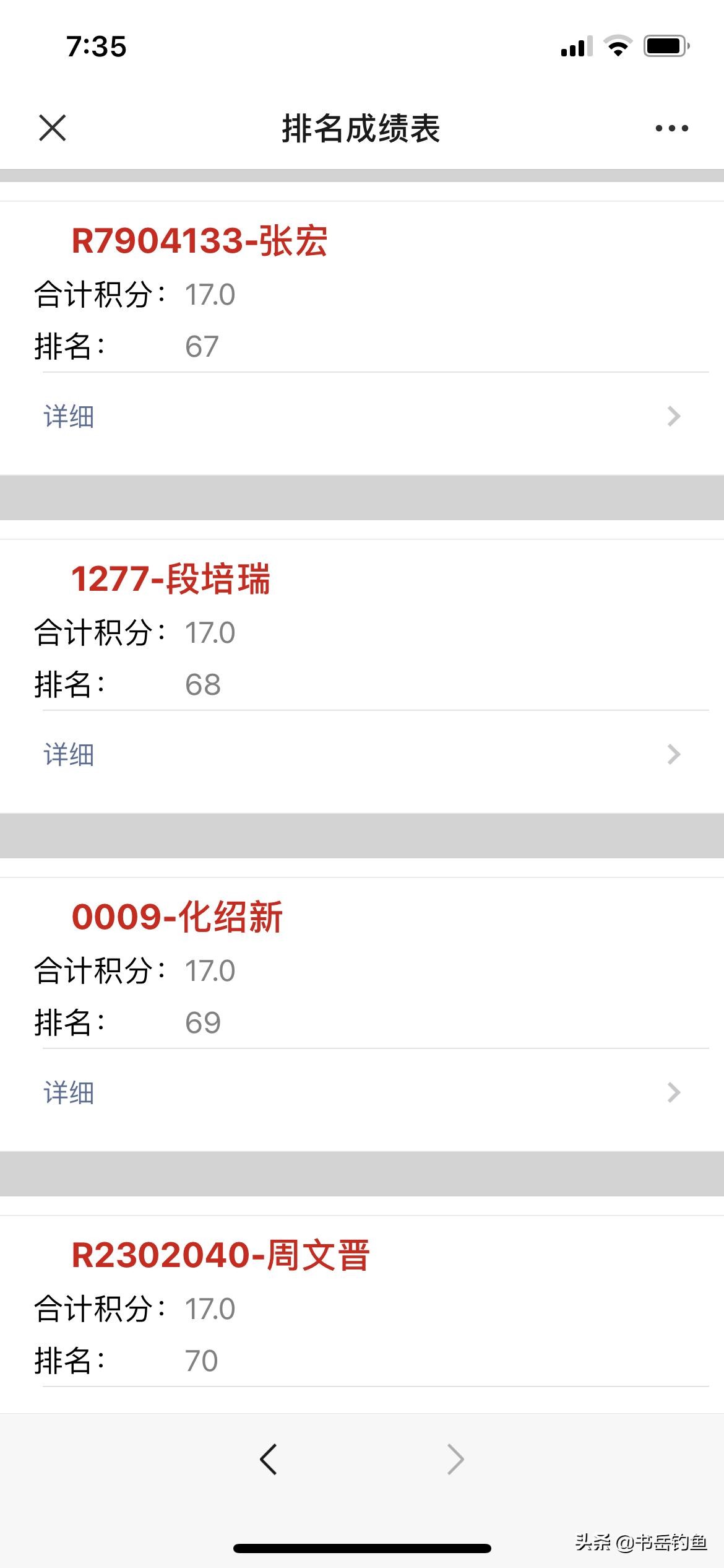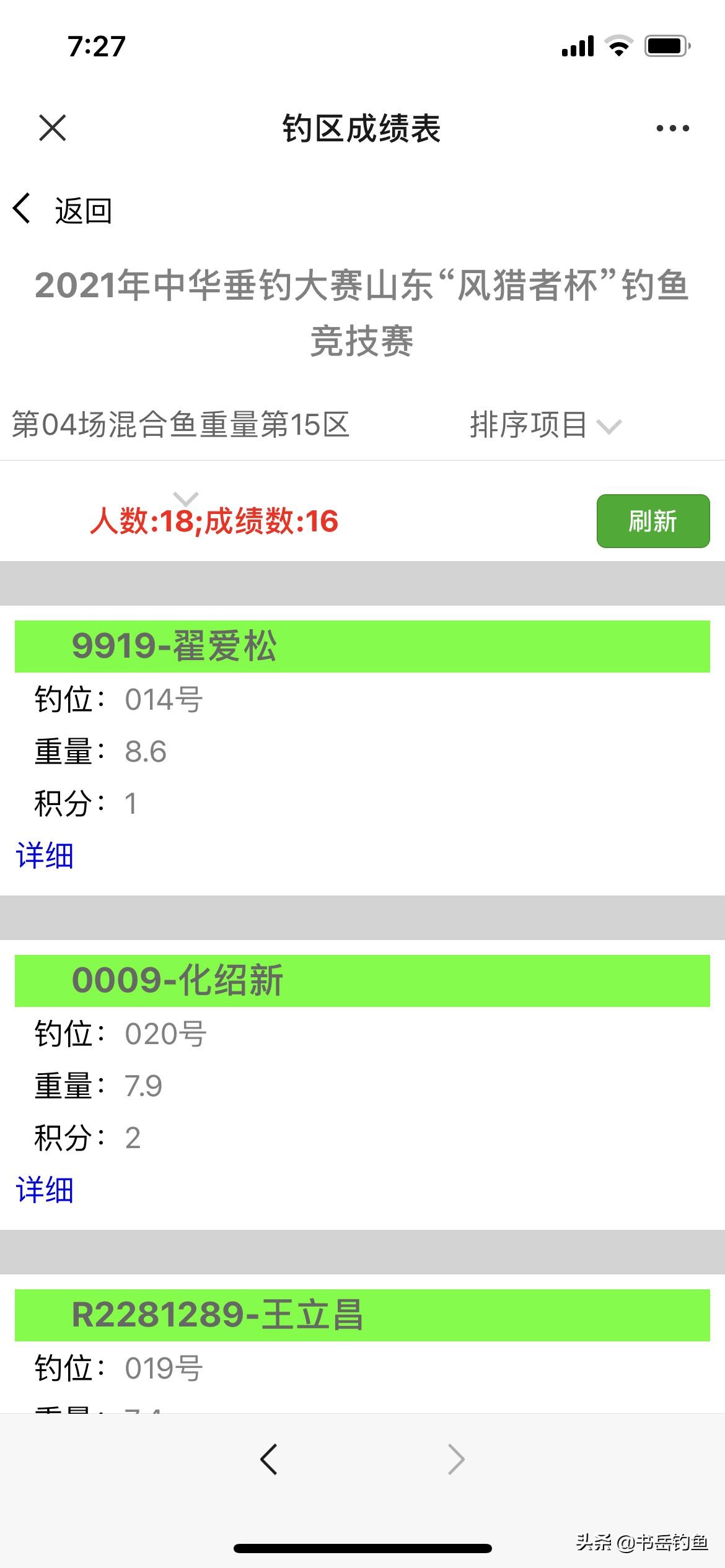 排在前几名的张小鹏,刘彬,刘松松都是非常年轻,并且常年浸润在竞技赛场当中。以其年轻的蓬勃朝气和充沛的体能,赢得了本场比赛较好的成绩。而化老师面对复杂的鱼情,又是哪里失利了呢?不妨看看详细成绩。