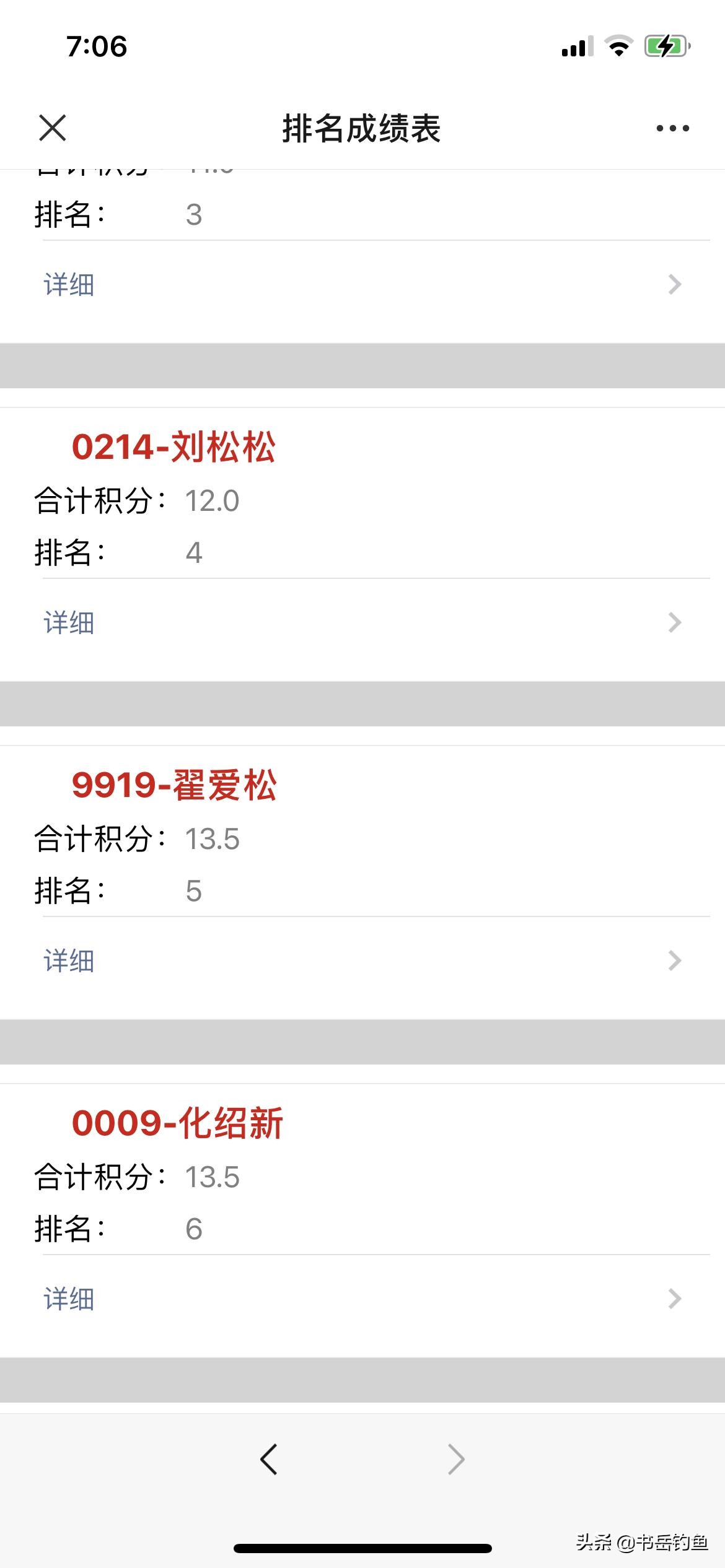 比赛到了第四场,化老师继续发挥饵料对路的优势,强势的在15区20号位拿下了2分的好成绩。至此比赛结束,化老师总积分13.5分,获得第六的成绩。
