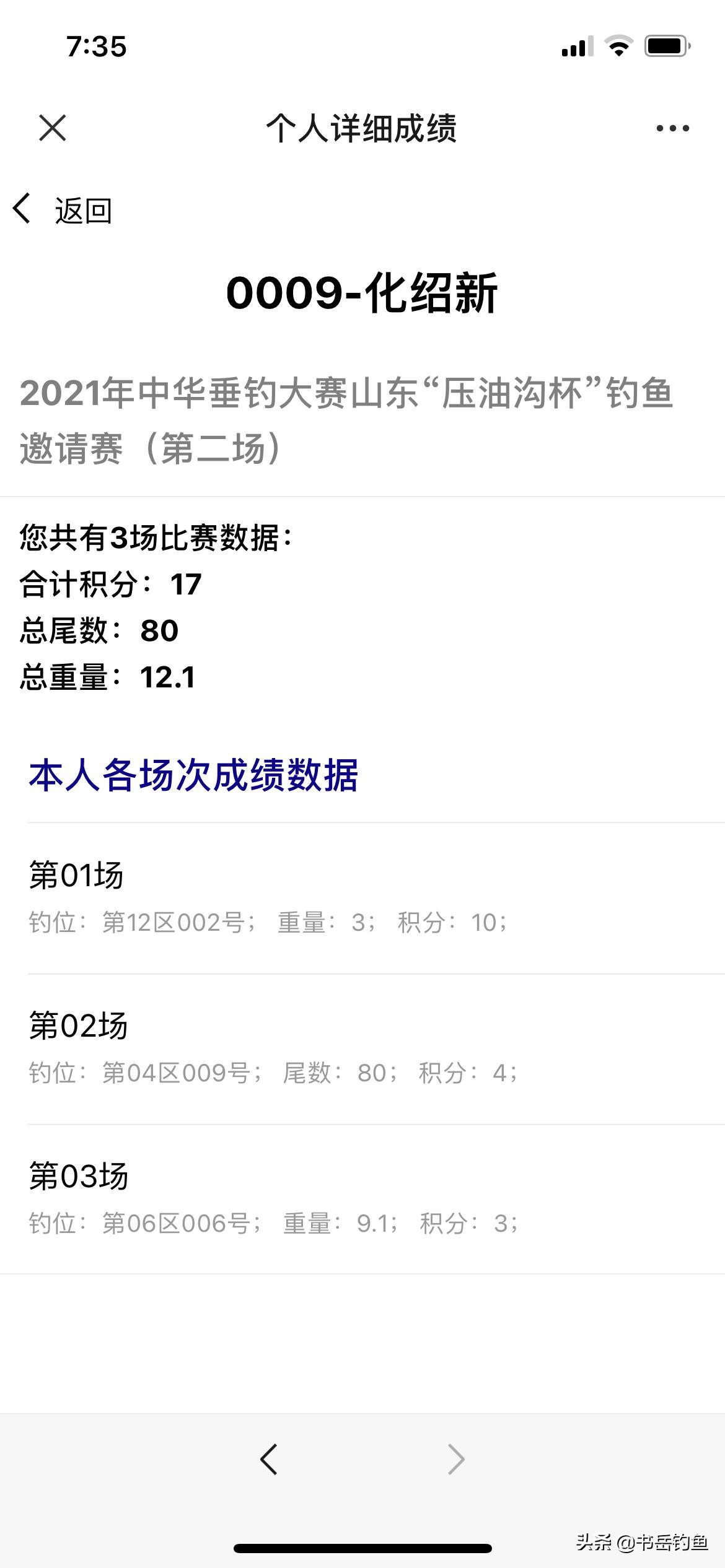 在三月二十一日举办的中华垂钓大赛,山东“风猎者杯”钓鱼竞技赛中,化绍新老师取得了第六名的成绩。这样的成绩对于久经赛场,上了年纪的化老师来说不好也不坏,尚未能展示出其王者的实力。